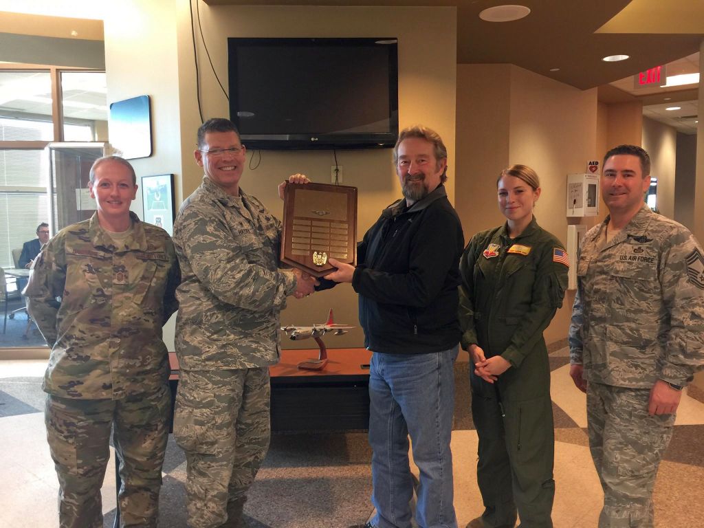 LATE ADDITION: Photo of presentation of a replica of 60528 and a plaque with the names of the crew to LtCol Casey Haden and CMSgt Dave Monaco, on behalf of the PWG at the 97th IS. Click on the thumbnail below for a larger image.
